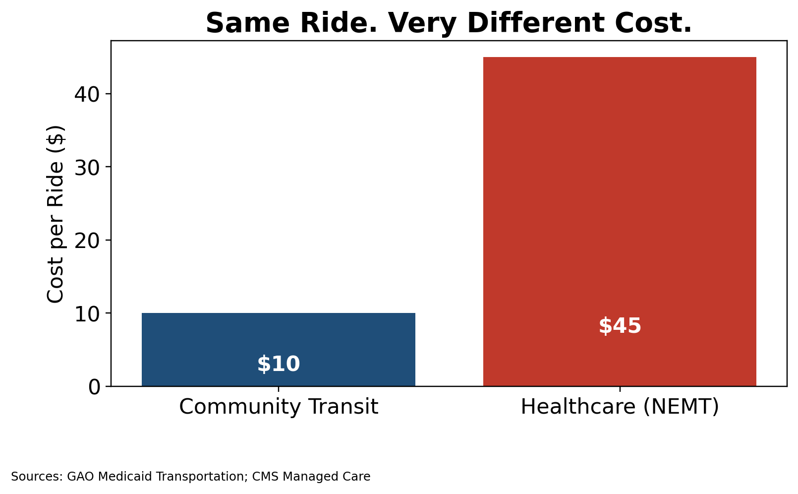 Transportation shows this clearly. Community transit programs and voucher systems typically cost five to fifteen dollars per ride. They move people efficiently and predictably. Medicaid non-emergency medical transportation frequently costs thirty to sixty dollars per ride.