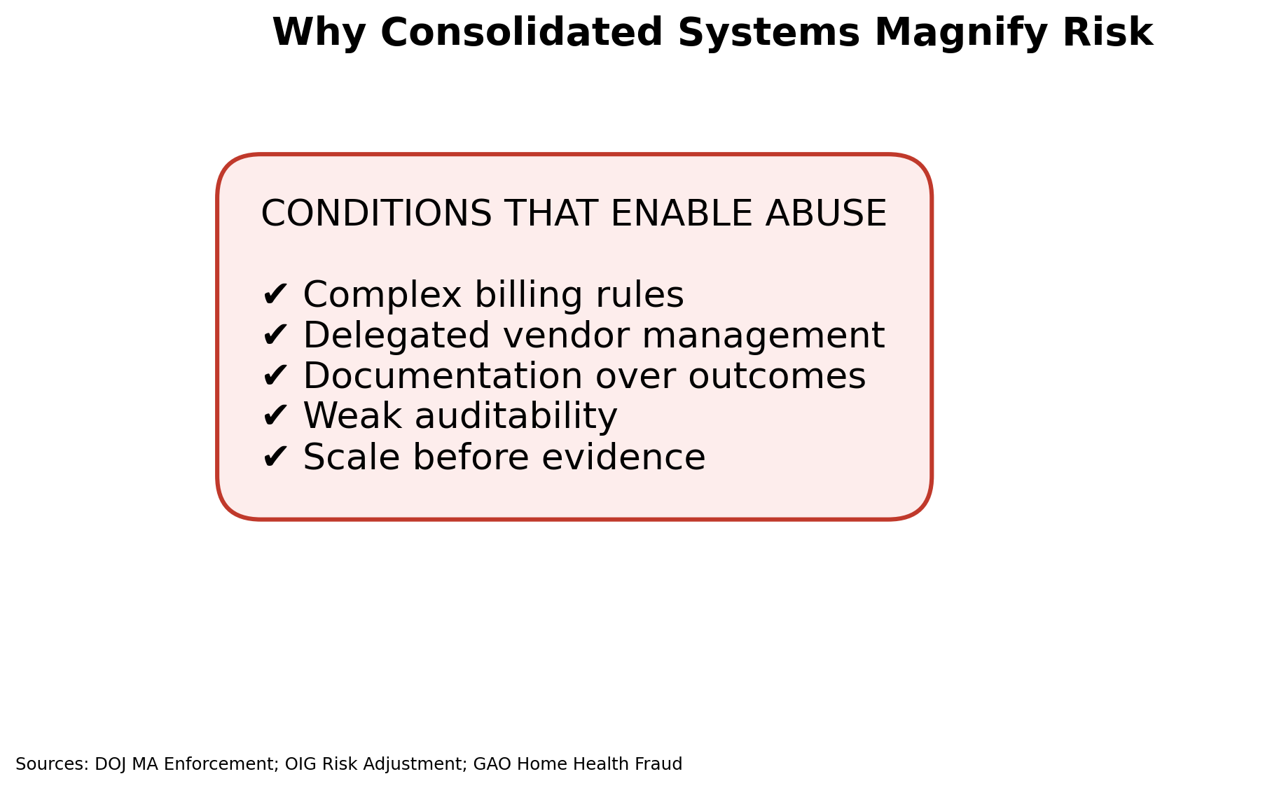 Administrative complexity, delegated vendor models, and weak outcome verification increase waste and abuse risk in consolidated systems.