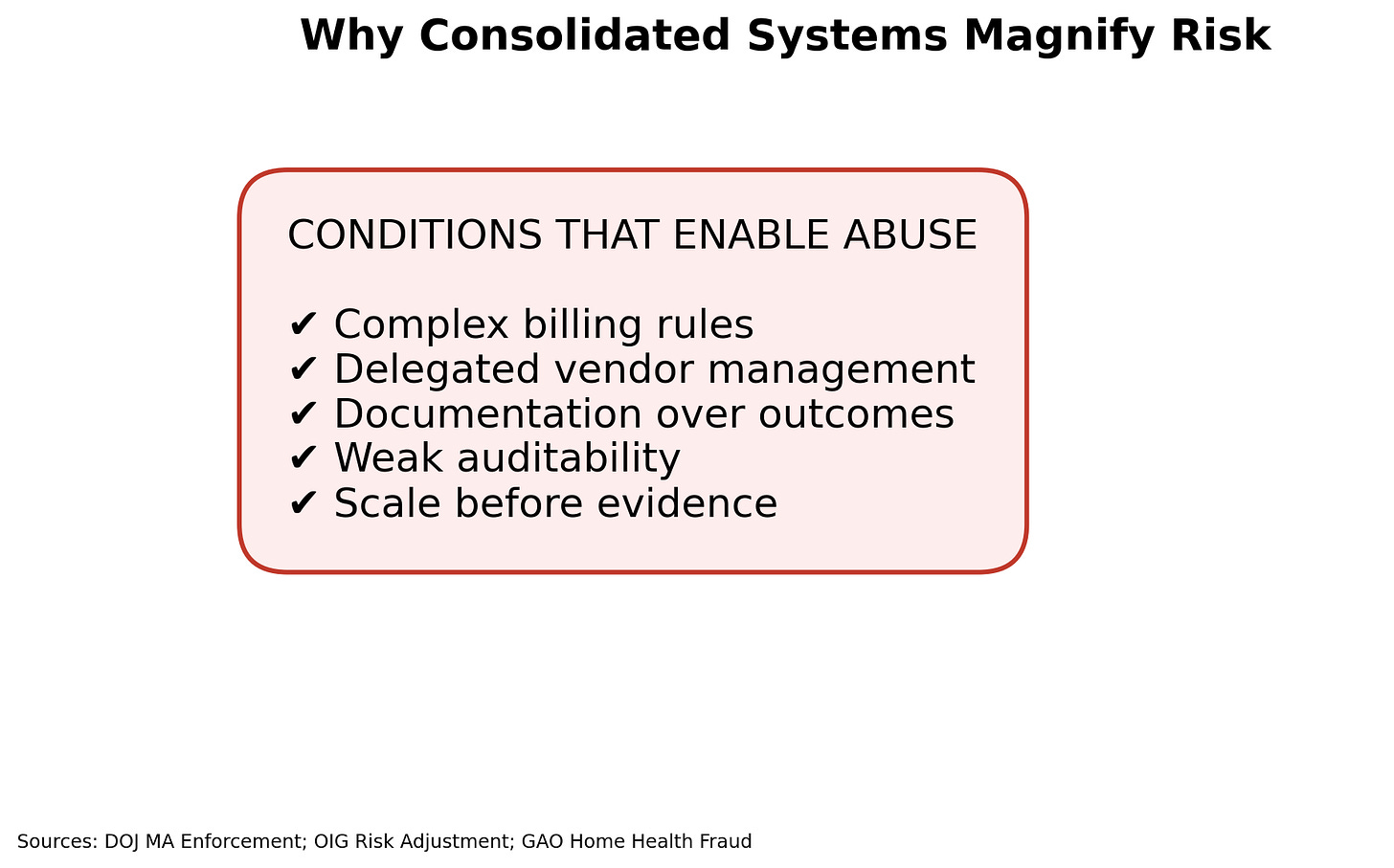 This pattern has appeared in other areas of healthcare. Medicare Advantage risk adjustment. Home health services. Behavioral health carve-outs. Payment expanded faster than oversight. Documentation replaced outcomes. Consolidated entities captured revenue while performance lagged.