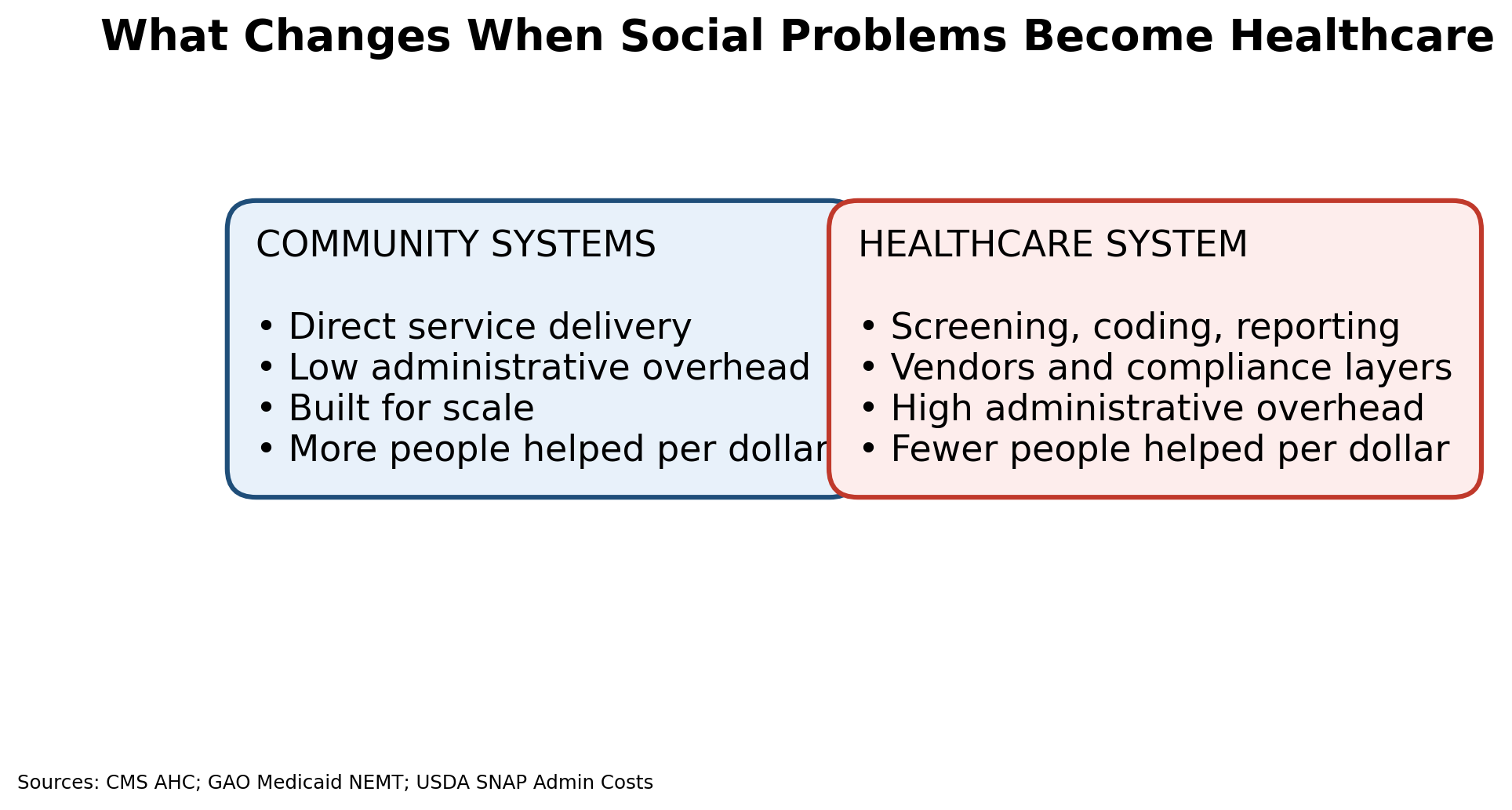 When social services are delivered through healthcare, they inherit healthcare’s structure by default. Cost increases. Access narrows. Friction rises. This follows directly from how the system is organized.