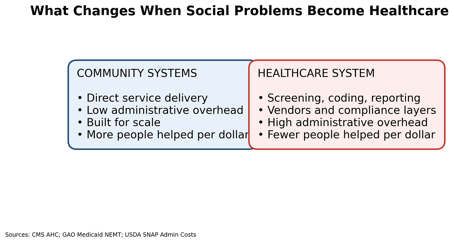 When social services are incorporated into healthcare, they become part of that administrative structure. Screening tools, referral platforms, care management teams, vendor networks, and reporting systems add cost regardless of service resolution.