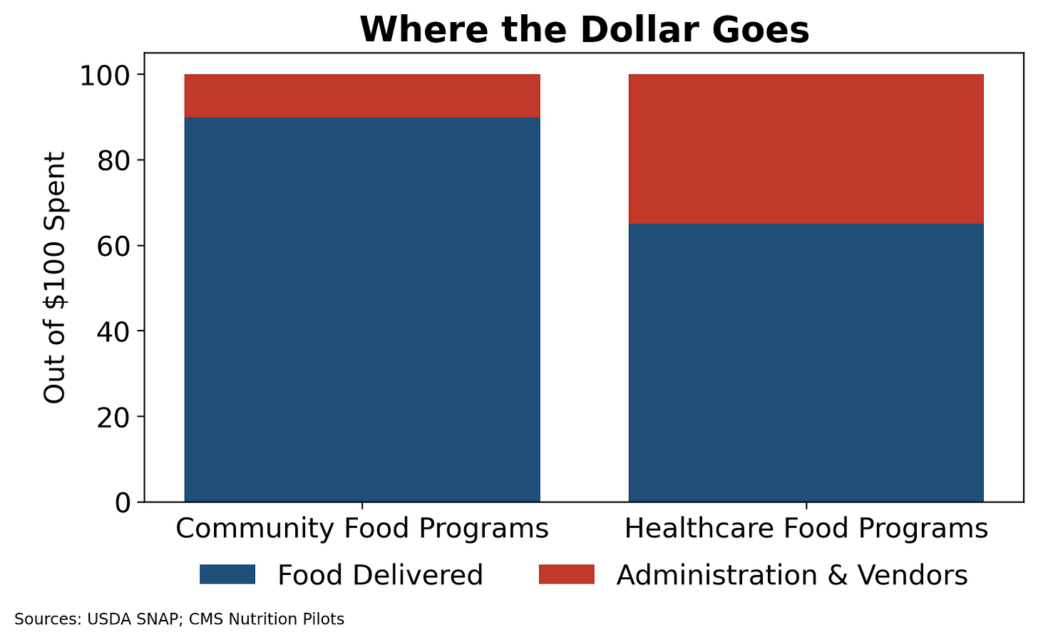 Healthcare-delivered food programs carry substantially higher administrative and vendor overhead.